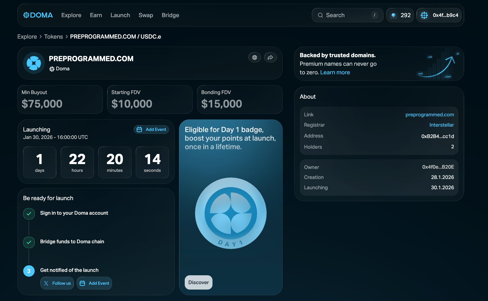 “For the first time ever, you can own fractional shares of PreProgrammed.com—a premium one-word .com domain—through tokenized ownership on DOMA.xyz. No need for $500,000 in cash. No competing with billionaires. Just transparent, blockchain-based fractional ownership of one of the most philosophically relevant domains in tech history.