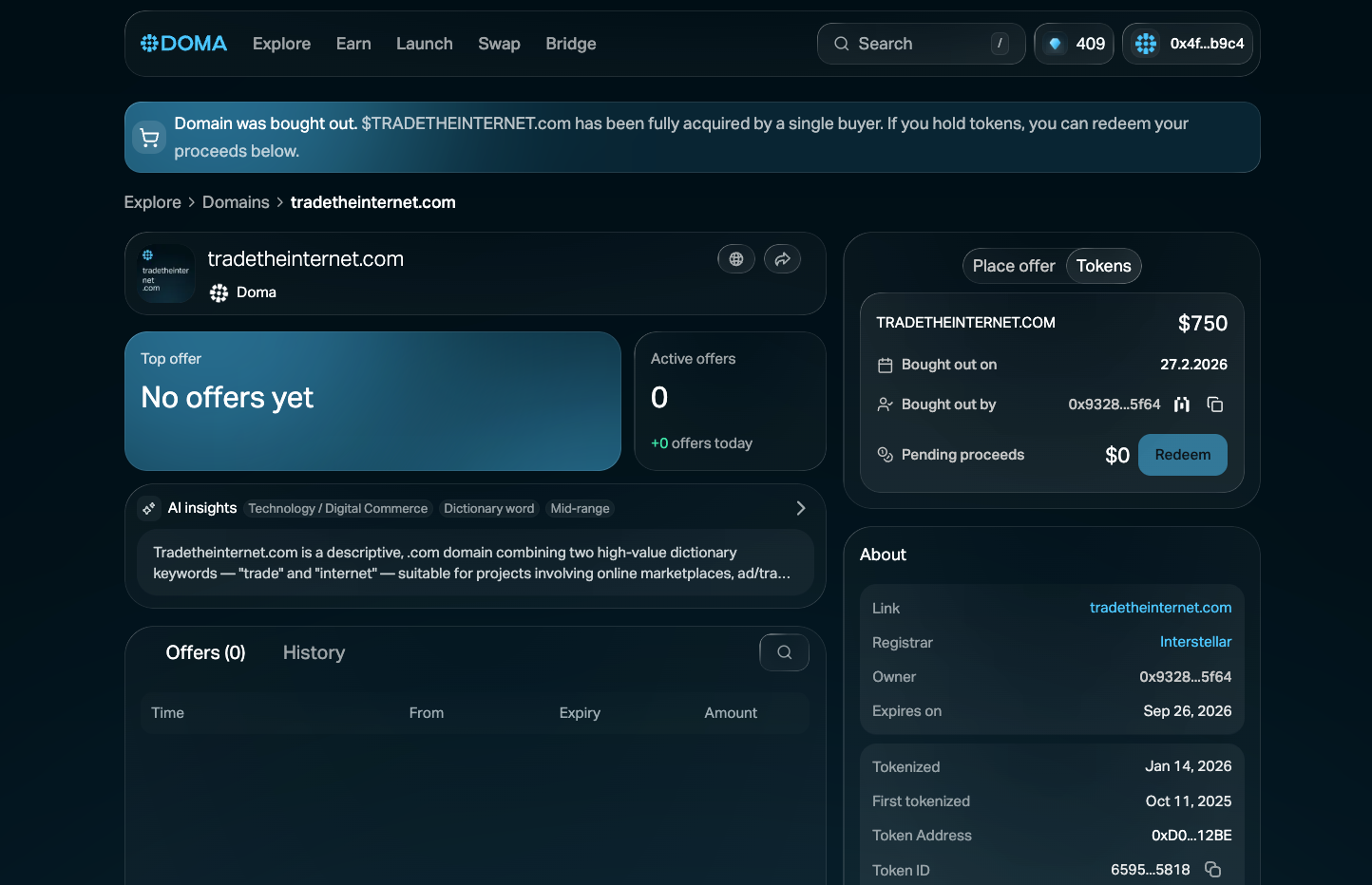 tradetheinternet.com was acquired on February 27 for $750, demonstrating how tokenized domains can transition from fractional ownership back into full ownership through a market-driven buyout.