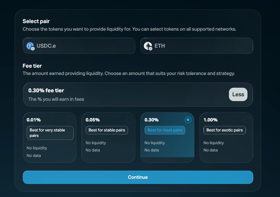 - Fee tiers now visible by default when providing liquidity, with the 0.3% tier pre-selected for convenience