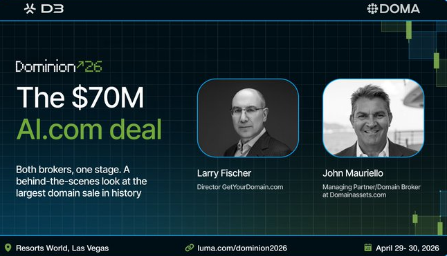 This week we also announced a special session for Dominion 2026 featuring the brokers behind the $70M AI.com domain transaction, the largest publicly reported domain sale in history.
