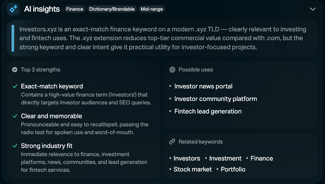 Instead of guessing or relying purely on intuition, AI Insights analyzes domains across industry fit, brandability, and practical utility.