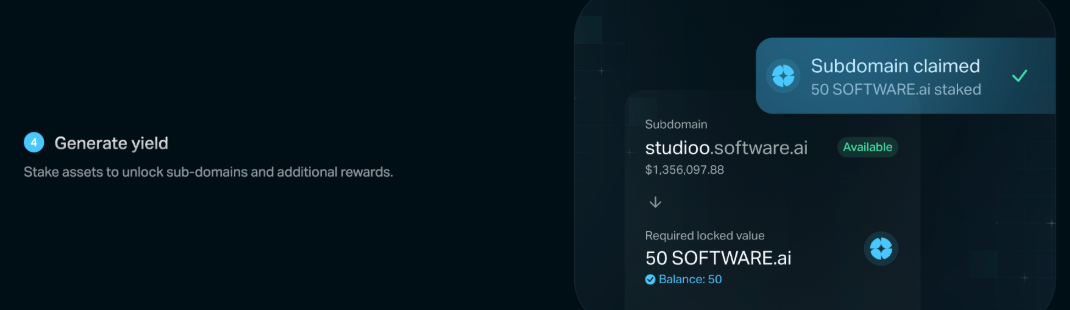 You can also stake tokens to access certain on-chain utilities, such as claiming subdomains. For example, in the screenshot below, you are staking 50 SOFTWARE.AI tokens to claim the studioo.software.ai subdomain.